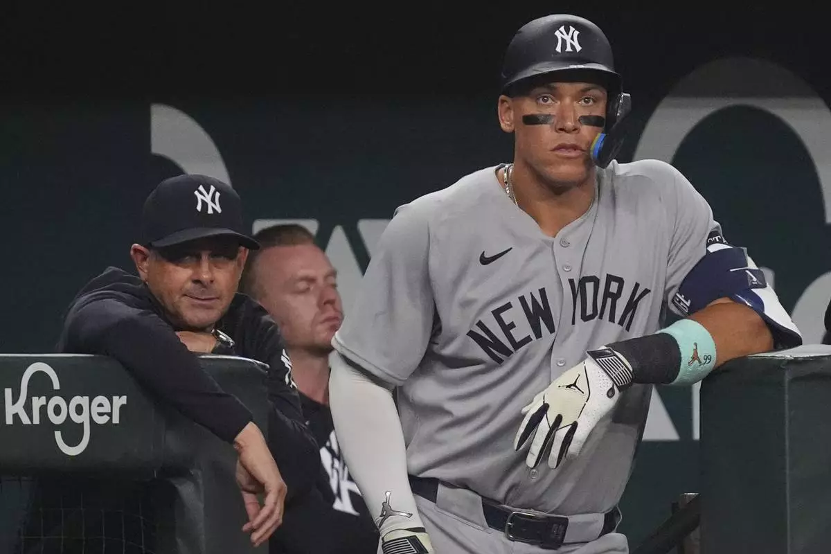 New York Yankees' Aaron Judge, right, and manager Aaron Boone look on from the dugout during the sixth inning of a baseball game against the Texas Rangers, Tuesday, Aug. 5, 2025, in Arlington, Texas. (AP Photo/LM Otero)