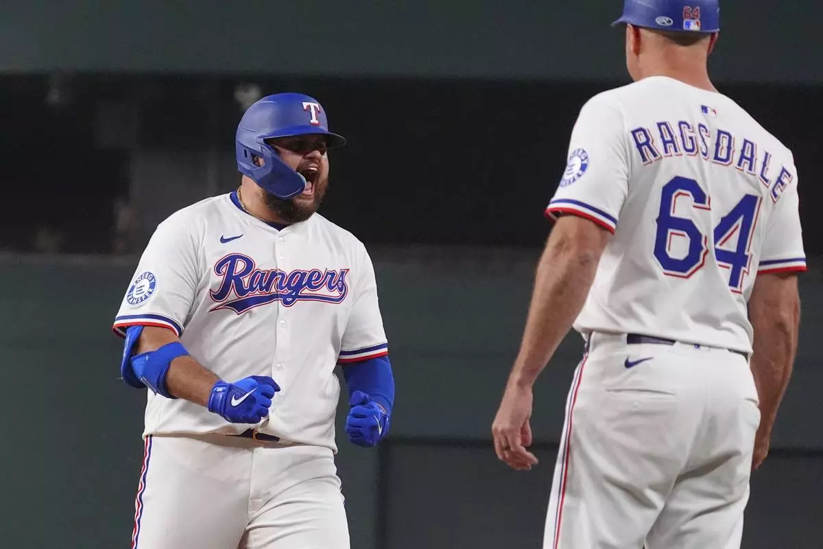 Texas Rangers' Rowdy Tellez, left, reacts in front of first base coach Corey Ragsdale (64) after hitting a single that scored teammates Adolis García and Joc Pederson during the 8th inning of a baseball game against the New York Yankees, Tuesday, Aug. 5, 2025, in Arlington, Texas. (AP Photo/LM Otero)
