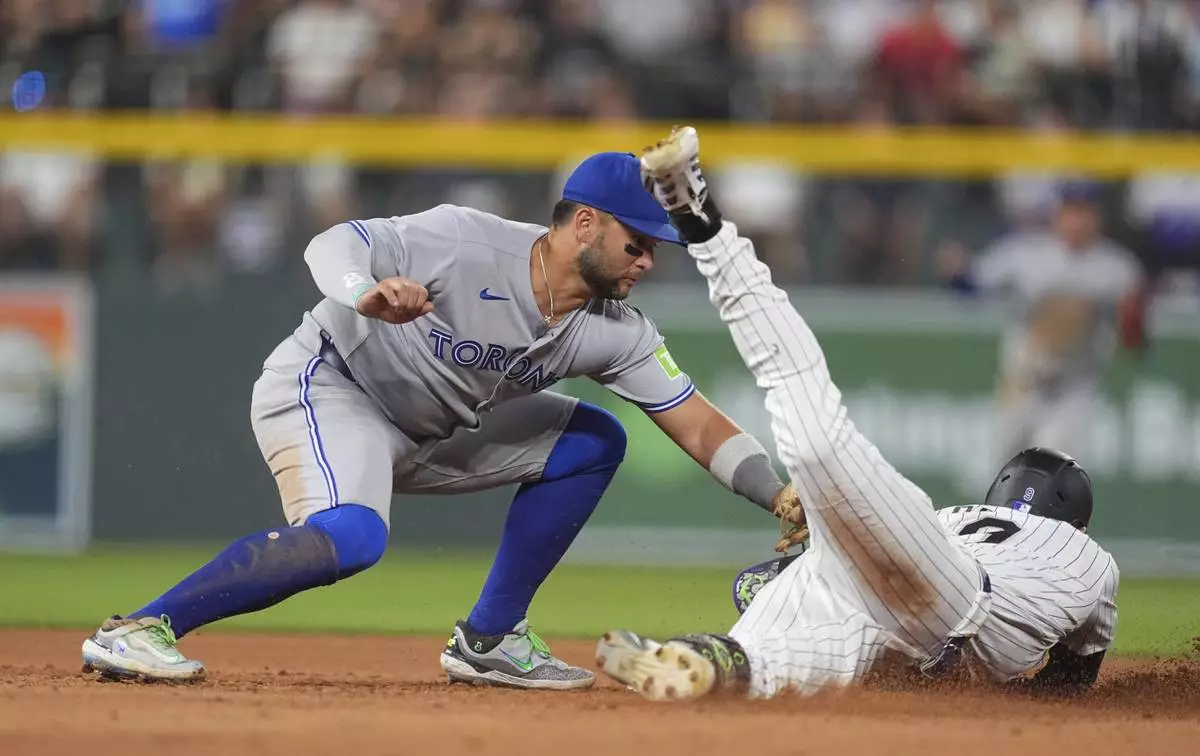 Toronto Blue Jays shortstop Bo Bichette, left, tags out Colorado Rockies' Brenton Doyle at second base as he tries to stretch a single into a double in the seventh inning of a baseball game Tuesday, Aug. 5, 2025, in Denver. (AP Photo/David Zalubowski)