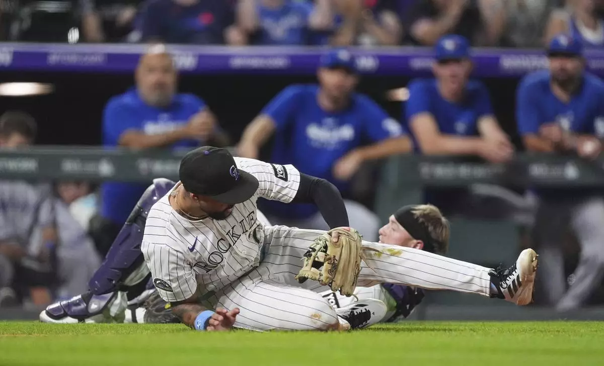 Colorado Rockies third baseman Warming Bernabel, front, collides with catcher Hunter Goodman while pursuing a foul ball off the bat of Toronto Blue Jays' Alejandro Kirk in the ninth inning of a baseball game Tuesday, Aug. 5, 2025, in Denver. (AP Photo/David Zalubowski)