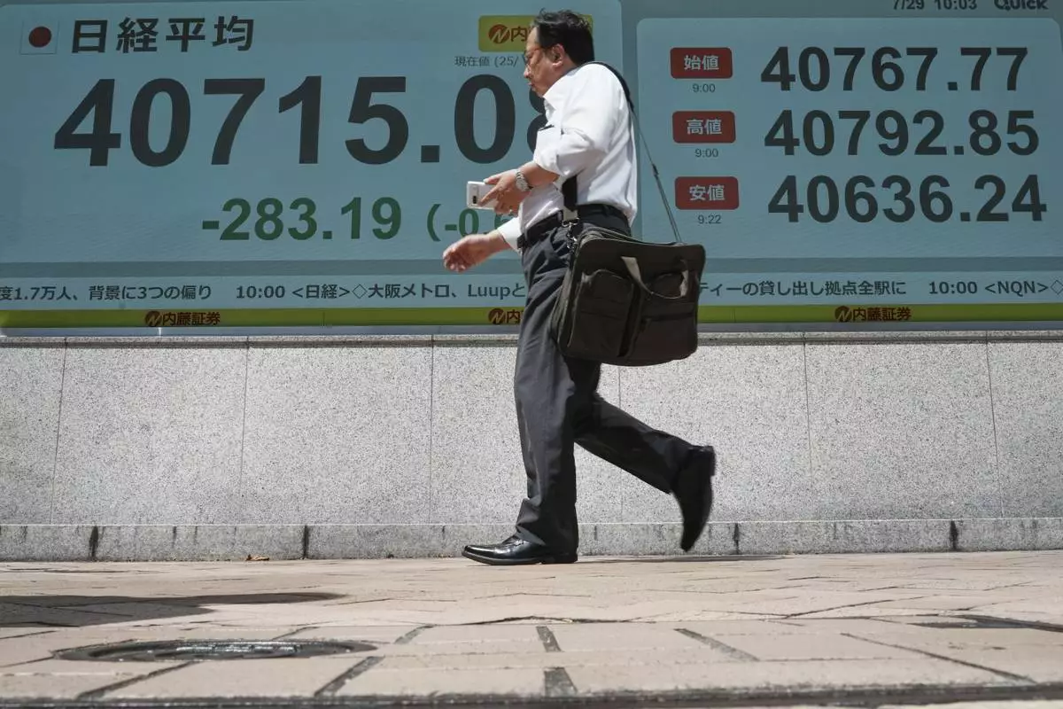 A person walks in front of an electronic stock board showing Japan's Nikkei index at a securities firm Tuesday, July 29, 2025, in Tokyo. (AP Photo/Eugene Hoshiko)