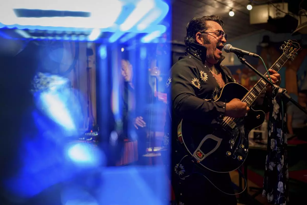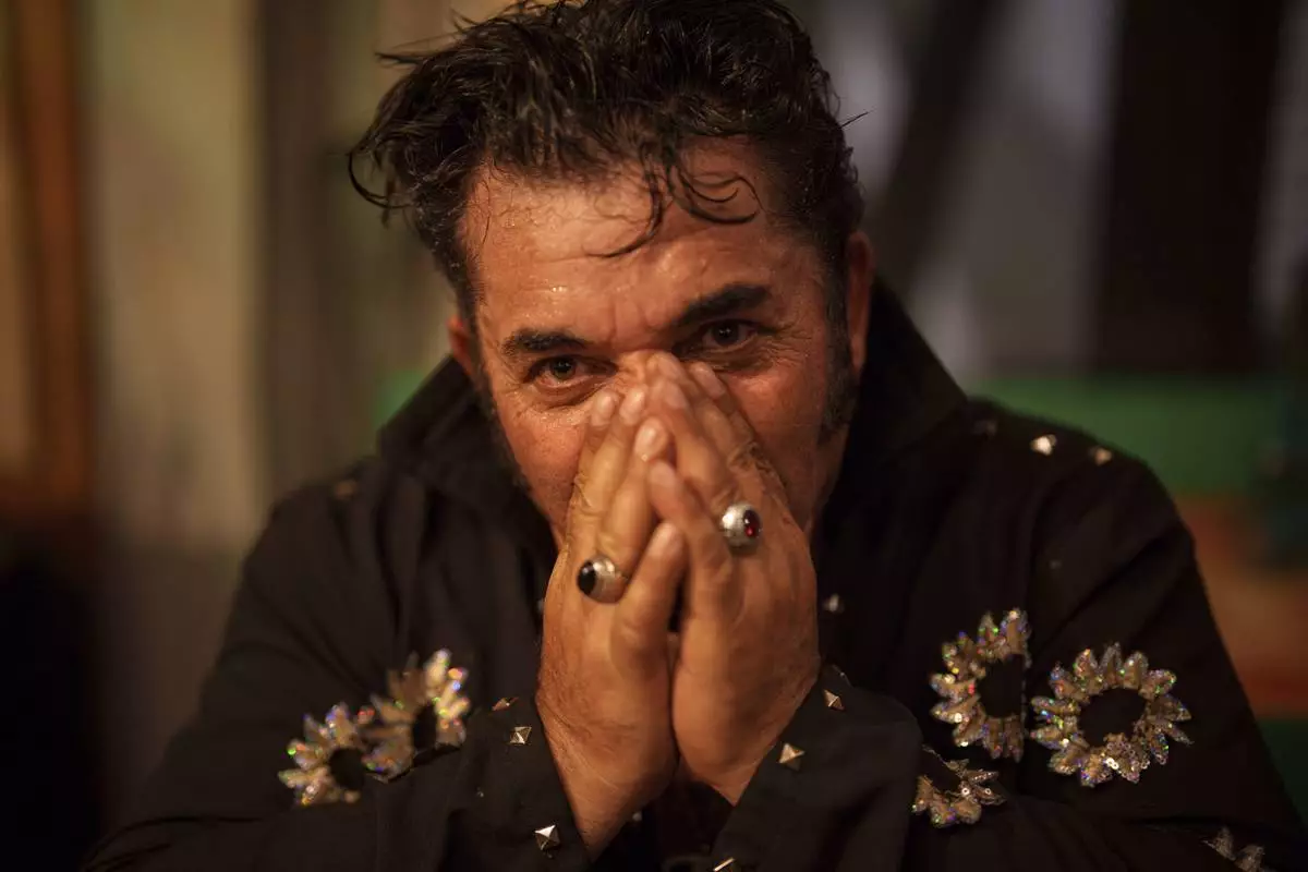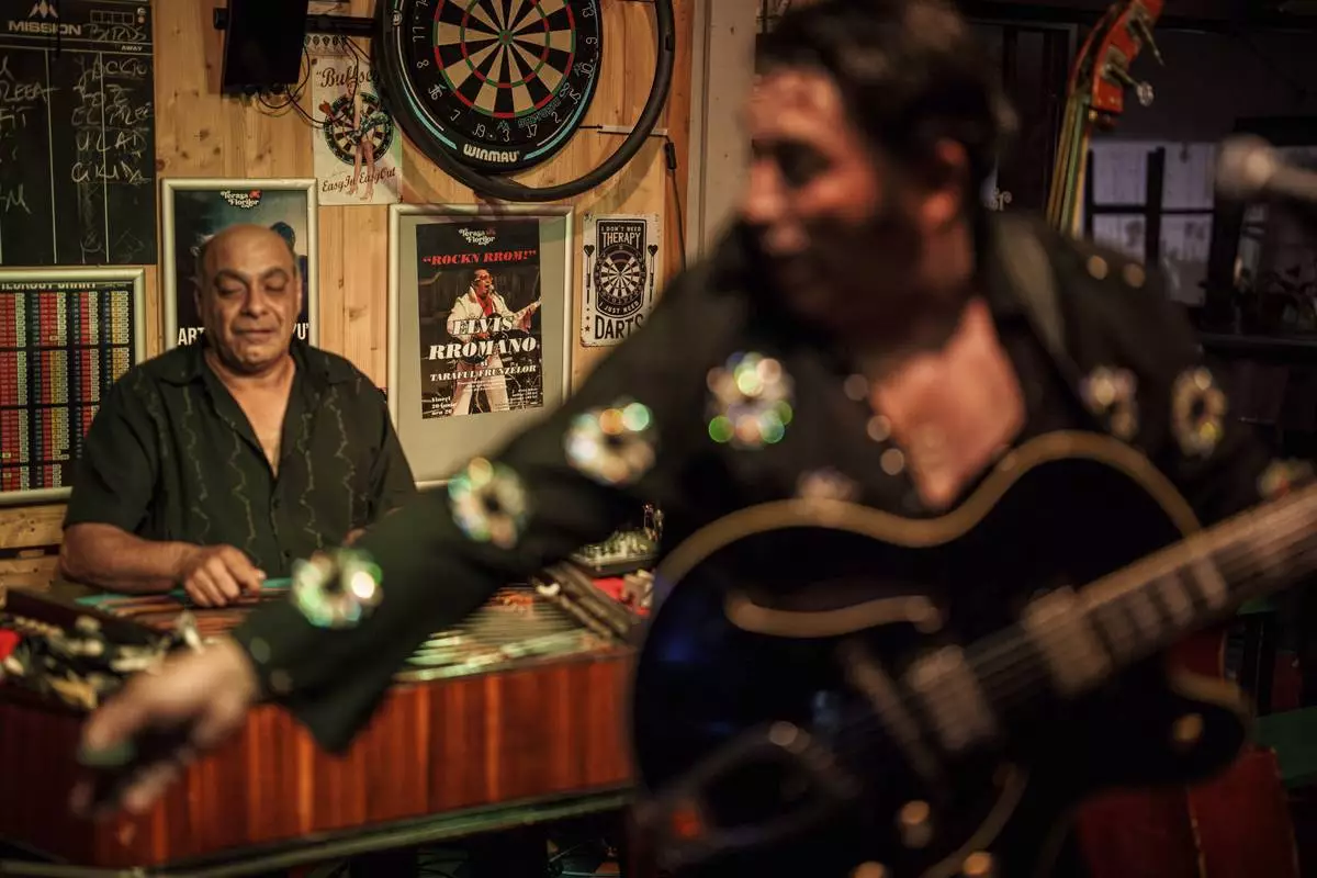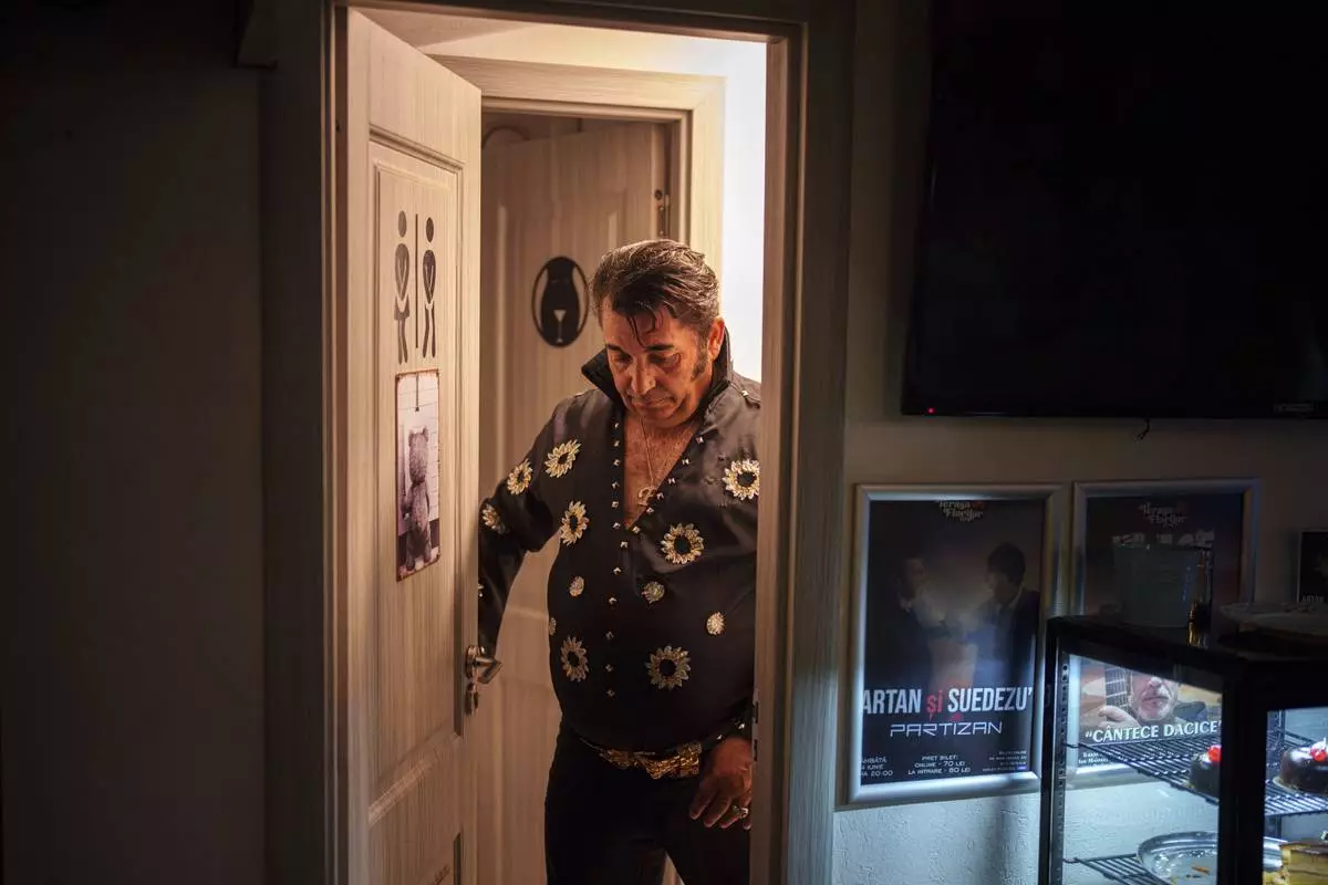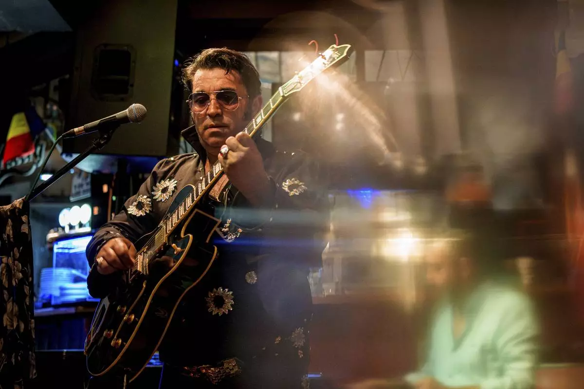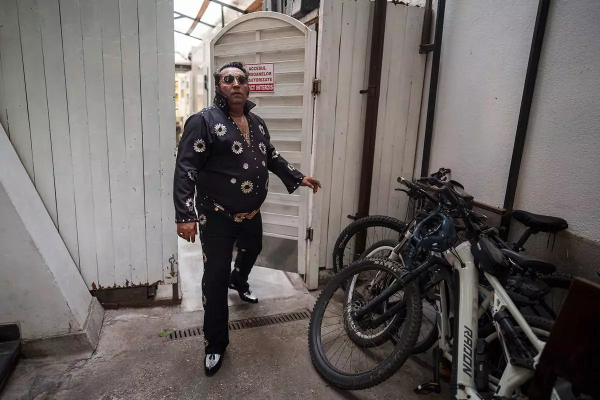 Dressed in a rhinestone shirt and oversized sunglasses, Lakatos performs unique versions of Elvis’ hits in a mix of Romani, Romanian and English.