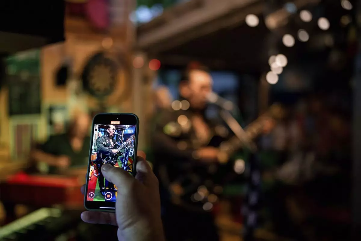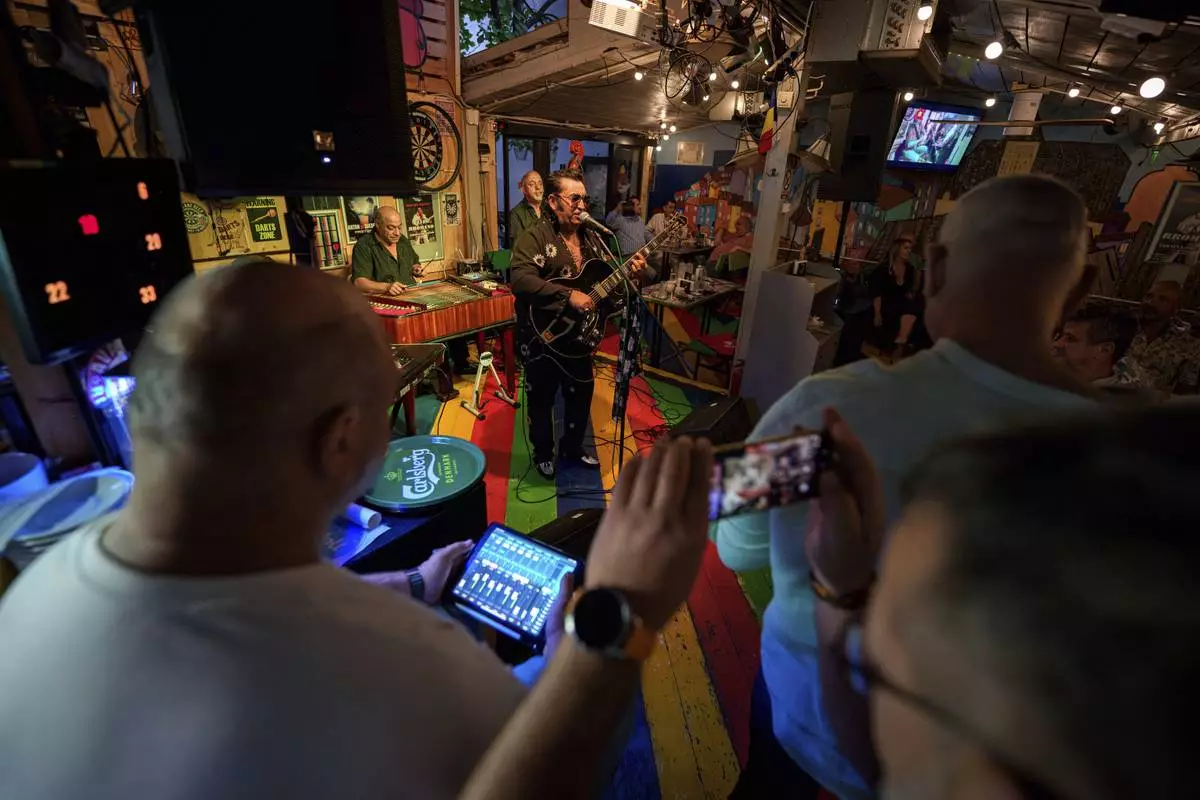 A customer records video of Tudor Lakatos, who goes by the stage name Elvis Rromano, performing at the Terasa Florilor restaurant with the Taraful Frunzelor band, in Bucharest, Romania, Friday, June 20, 2025. (AP Photo/Andreea Alexandru)