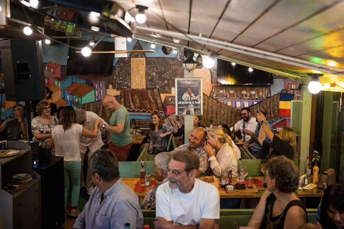 Customers dance as Tudor Lakatos, who goes by the stage name Elvis Rromano, performs at the Terasa Florilor restaurant with the Taraful Frunzelor band, in Bucharest, Romania, Friday, June 20, 2025. (AP Photo/Andreea Alexandru)