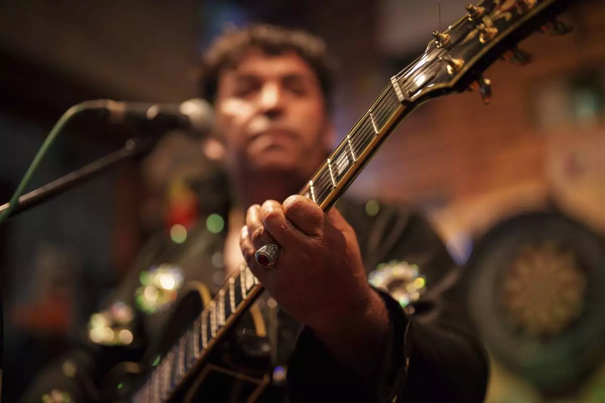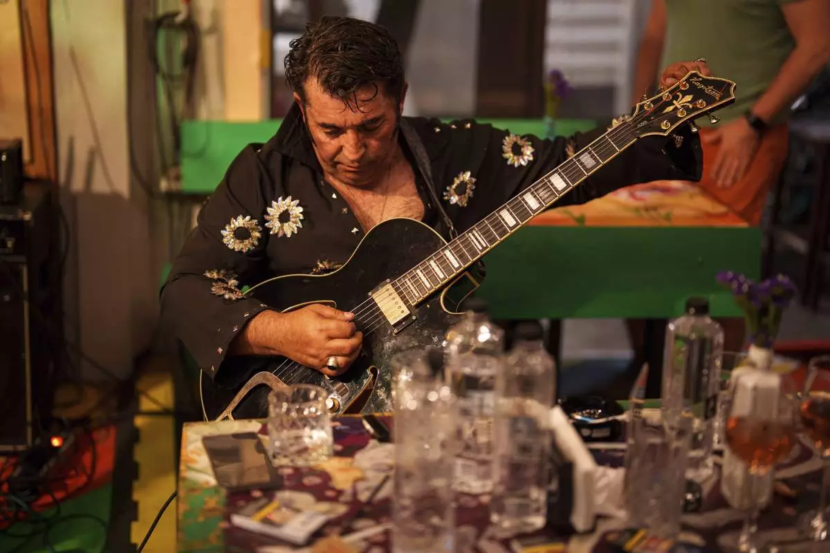 Tudor Lakatos, who goes by the stage name Elvis Rromano, tunes his guitar during a performance at the Terasa Florilor restaurant in Bucharest, Romania, Friday, June 20, 2025. (AP Photo/Vadim Ghirda)