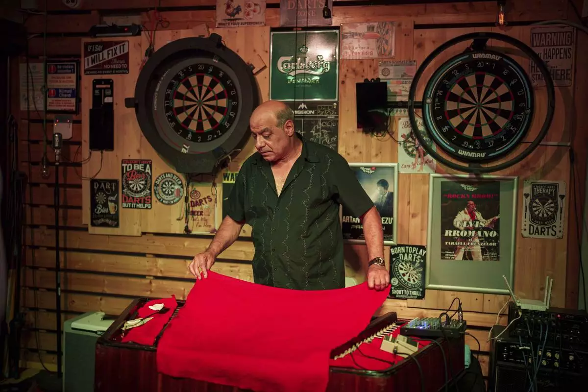 Tudor Lakatos, who goes by the stage name Elvis Rromano, walks to the stage before a performance at the Terasa Florilor restaurant in Bucharest, Romania, Friday, June 20, 2025. (AP Photo/Vadim Ghirda)