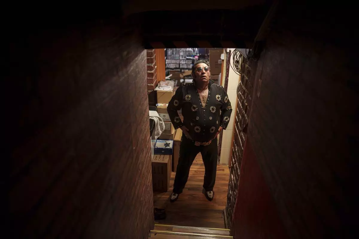 Tudor Lakatos, who goes by the stage name Elvis Rromano, exits the restroom during a break in his performance at the Terasa Florilor restaurant in Bucharest, Romania, Friday, June 20, 2025. (AP Photo/Vadim Ghirda)