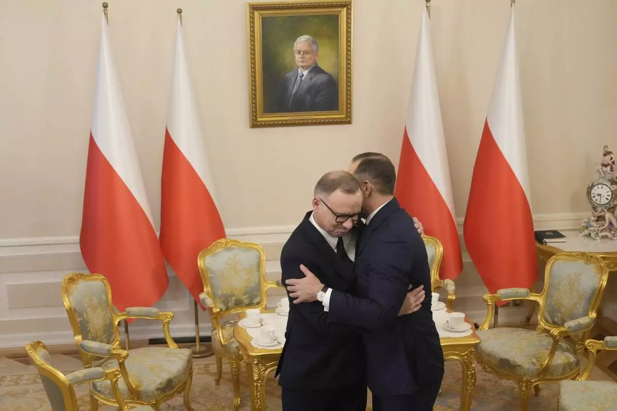 FILE - Poland's outgoing President Andrzej Duda, left, welcomes the President Elect Karol Nawrocki at the Presidential Palace in Warsaw, Poland, Tuesday, June 3, 2025. (AP Photo/Czarek Sokolowski, File)