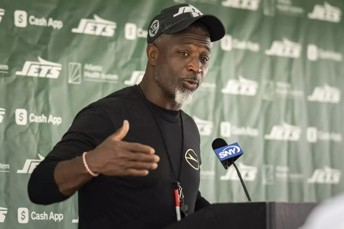 New York Jets head coach Aaron Glenn speaks at a press conference following practice at the team's NFL football training camp, Saturday, July 26, 2025, in Florham Park, N.J. (AP Photo/Angelina Katsanis)
