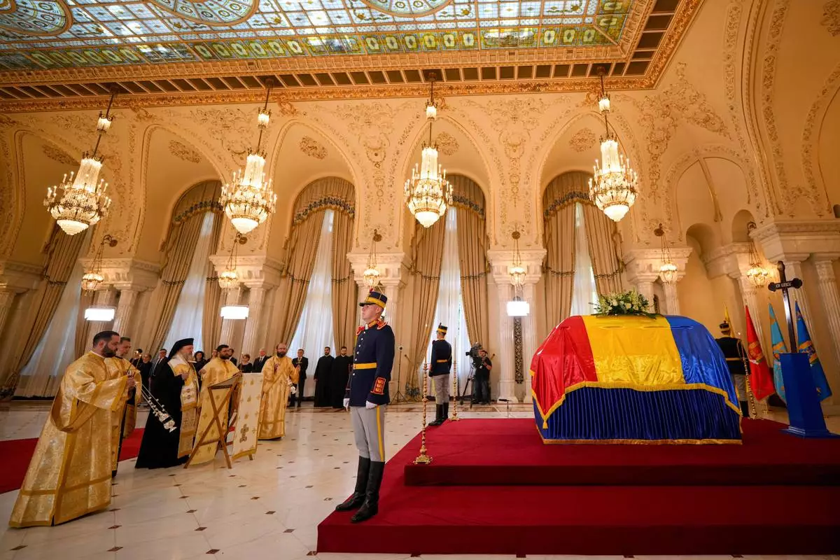 A priest performs a brief religious service next to the coffin of the late Ion Iliescu, Romania's first freely elected president after the fall of communism in 1989, at the Cotroceni Presidential Palace, in Bucharest, Romania, Wednesday, Aug. 6, 2025.(AP Photo/Vadim Ghirda)