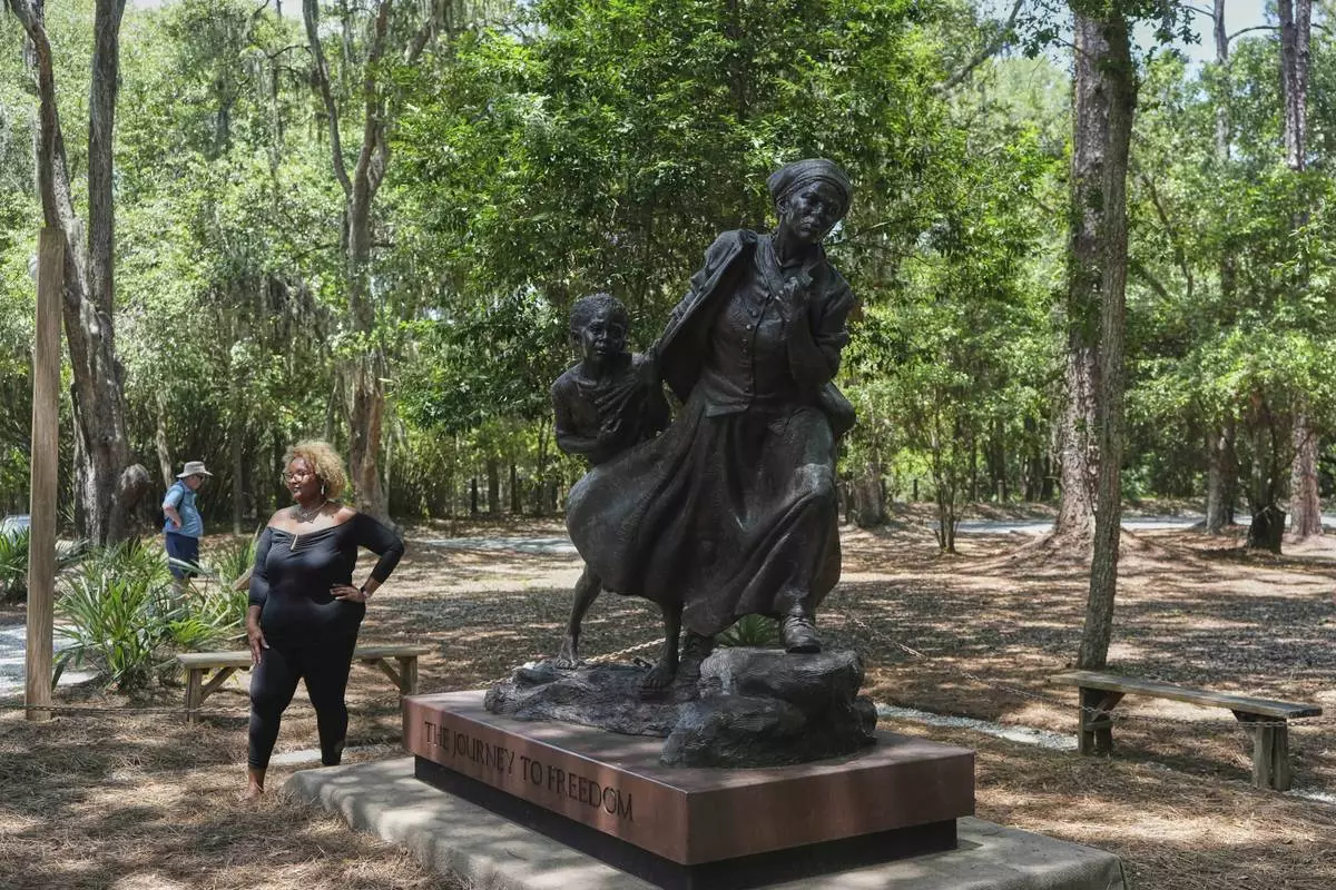 A visitor poses for a photo next to a statue of Harriet Tubman and a child titled "Journey to Freedom," at Historic Mitchelville Freedom Park on Hilton Head Island, Sunday, July 20, 2025. (AP Photo/Luis Andres Henao)