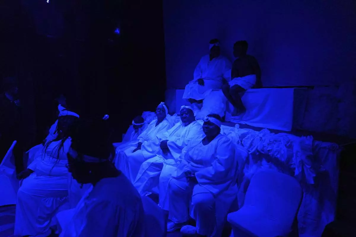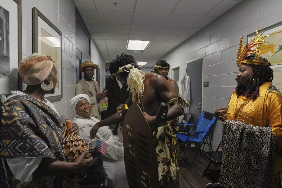 Actors wait on stage before the start of the play "Da'Gullah American Revolution" at the May River Theatre in Bluffton, South Carolina, Saturday, July 19, 2025. (AP Photo/Luis Andres Henao)
