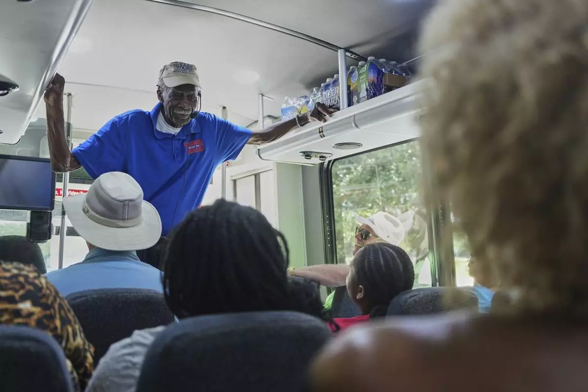 Gullah Heritage Trails Tours founder Emory Campbell talks to tourists during a visit to historic Gullah neighborhoods on Hilton Head Island, Sunday, July 20, 2025. (AP Photo/Luis Andres Henao)