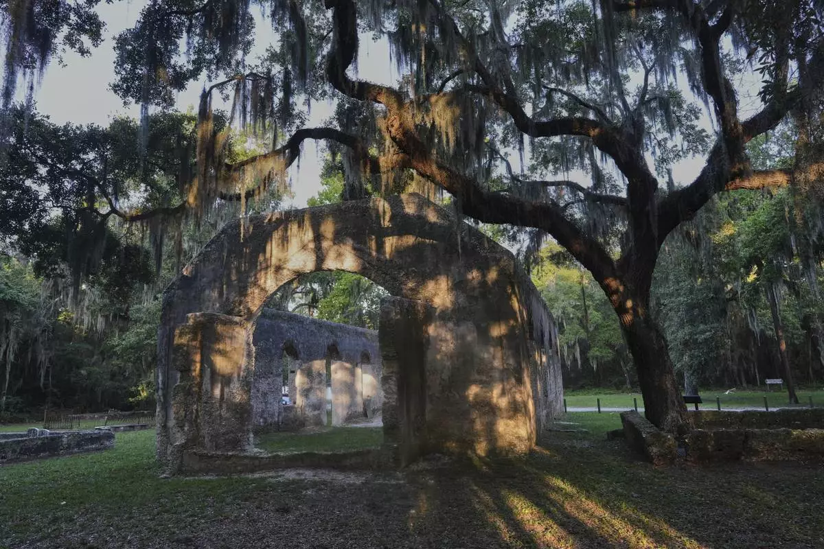 Spanish moss covers oak trees at the ruins of the St. Helena Parish Chapel of Ease on St. Helena Island, South Carolina, Monday, July 21, 2025. (AP Photo/Luis Andres Henao)