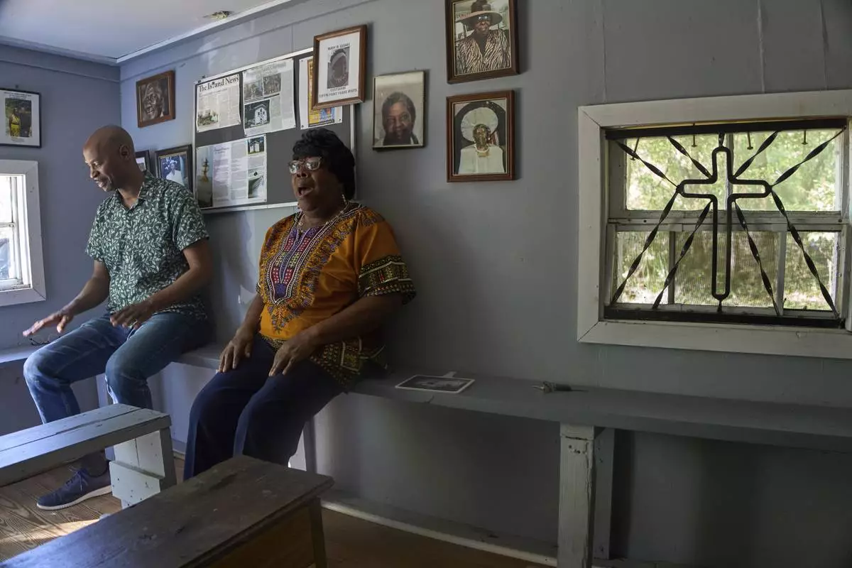 "Voices of Gullah" singer Minnie "Gracie" Gadson sings a Gullah spiritual while musicologist Eric Crawford follows along patting his thighs in body percussion, at the Coffin Point Praise House in St. Helena Island, Sunday, July 20, 2025. (AP Photo/Luis Andres Henao)