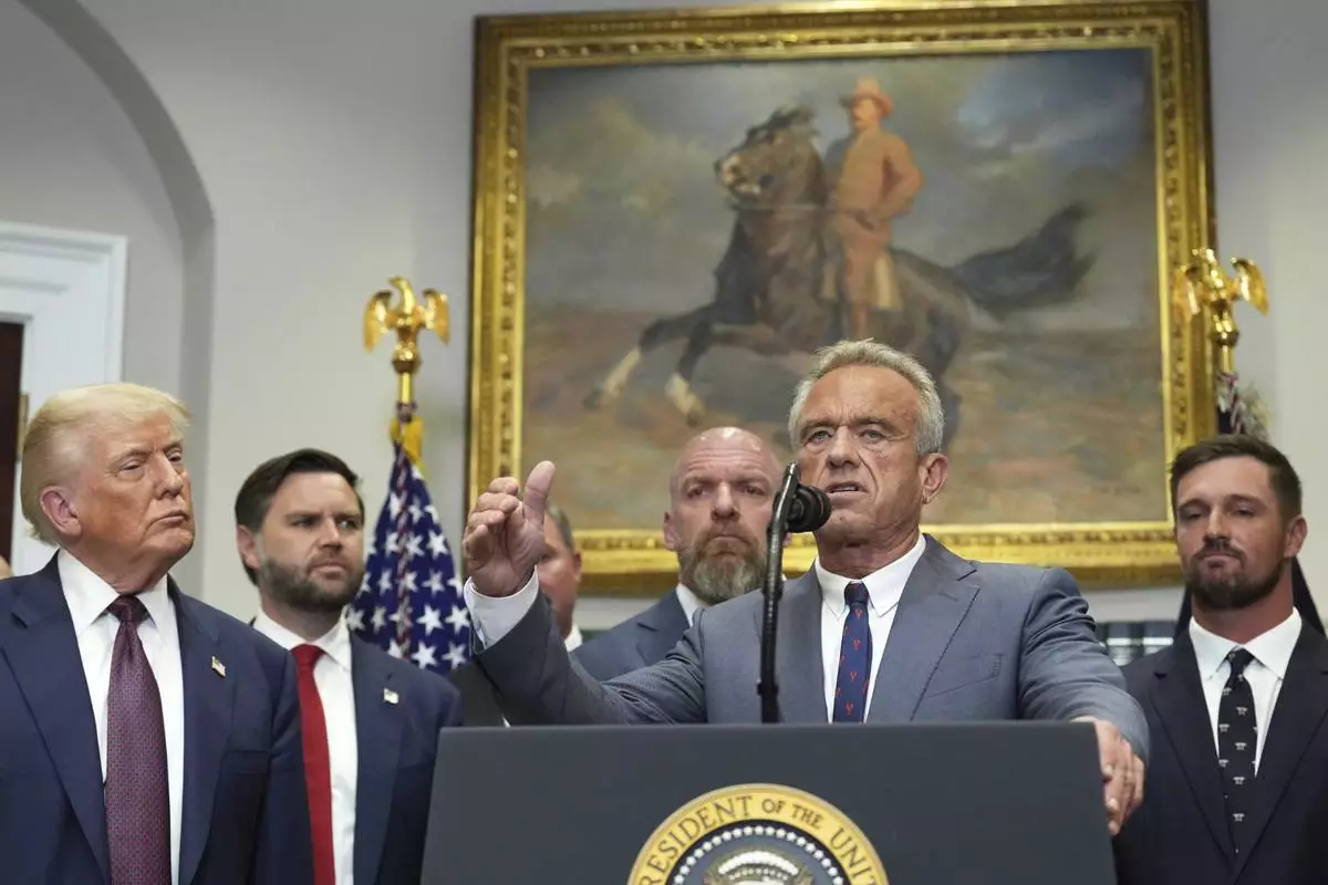 Health and Human Services Secretary Robert F. Kennedy Jr. speaks as President Donald Trump, from left, Vice President JD Vance, WWE CCO Triple H and professional golfer Bryson DeChambeau listen during an event for the signing of an executive order restarting the Presidential Fitness Test in public schools, Thursday, July 31, 2025, in the Roosevelt Room of the White House in Washington. (AP Photo/Jacquelyn Martin)