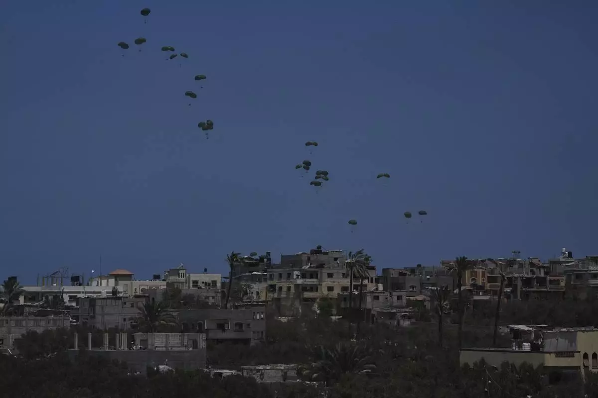Humanitarian aid is airdropped to Palestinians over Deir al-Balah, central Gaza Strip, Wednesday, Aug. 6, 2025. (AP Photo/Abdel Kareem Hana)