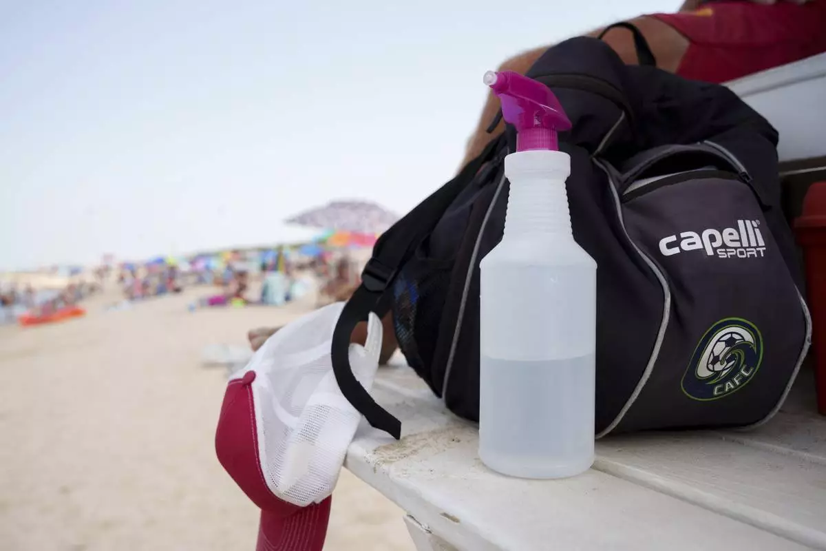 A vinegar-based solution, for the treatment of jellyfish stings, at a Lewes Beach Patrol lifeguard station at Savannah Beach, in Lewes, Del., on Wednesday, July 30, 2025. (AP Photo/Mingson Lau)