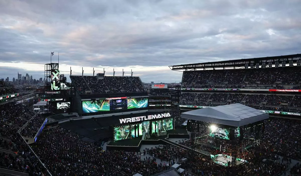 FILE - WrestleMania XL prepares at Lincoln Financial Field on Saturday, April 6, 2024. (Yong Kim/The Philadelphia Inquirer via AP, File)