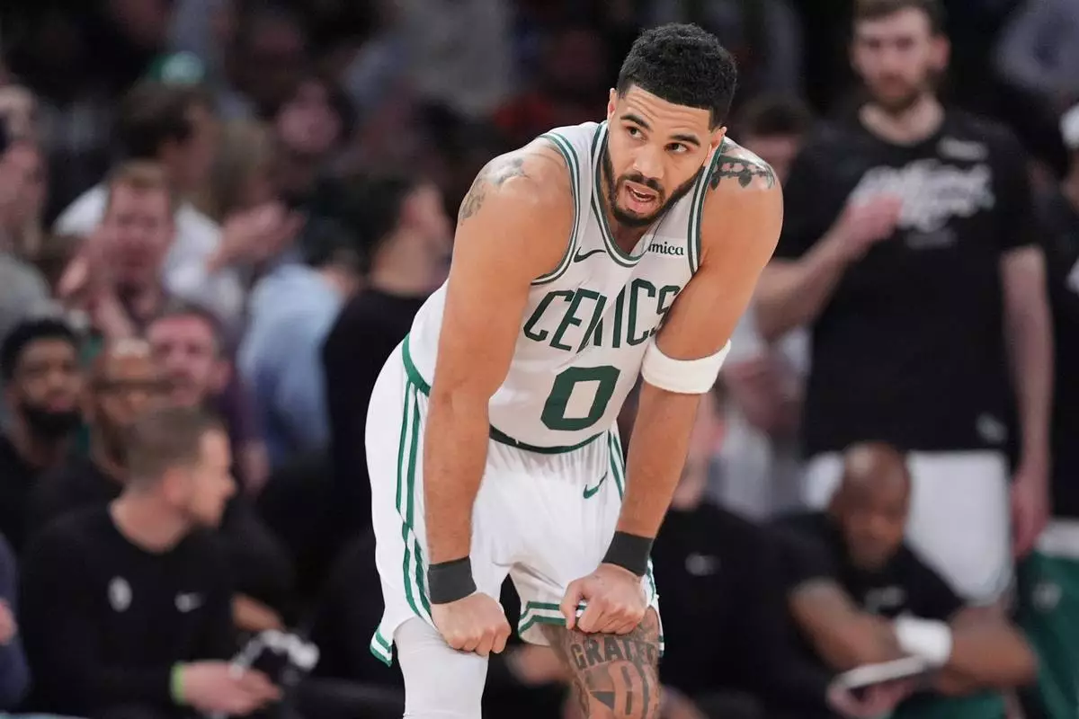 Boston Celtics' Jayson Tatum (0) rests during a break in the second half of Game 4 in the Eastern Conference semifinals of the NBA basketball playoffs against the New York Knicks Monday, May 12, 2025, in New York. (AP Photo/Frank Franklin II, File)