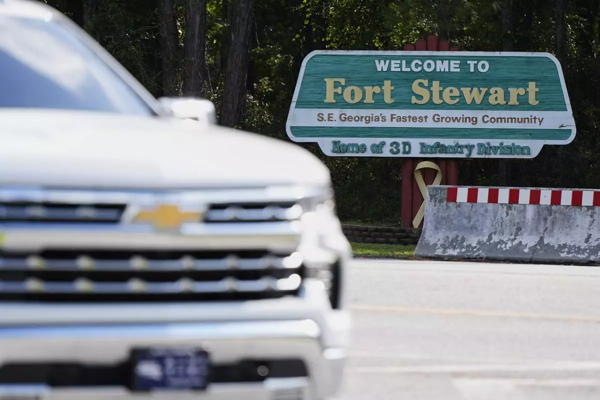 A sign outside the main gate of Fort Stewart, Georgia, is shown on Wednesday, Aug. 6, 2025. (AP Photo/Russ Bynum)