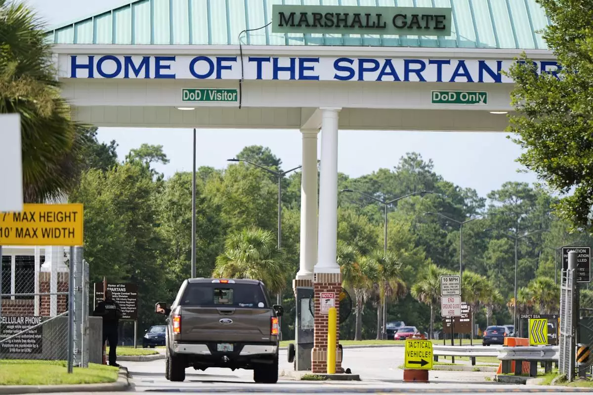 Marshall Gate at Fort Stewart in Georgia is seen on Wednesday, Aug. 6, 2025. (AP Photo/Mike Stewart)