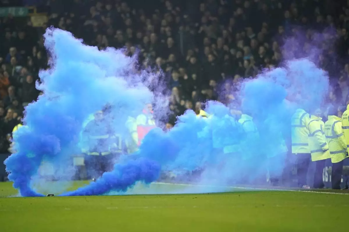 FILE - Soccer fans use a flare during the English Premier League soccer match between Everton and Liverpool, Liverpool, England, Wednesday, Feb.12, 2025. (AP Photo/Dave Thompson, File)