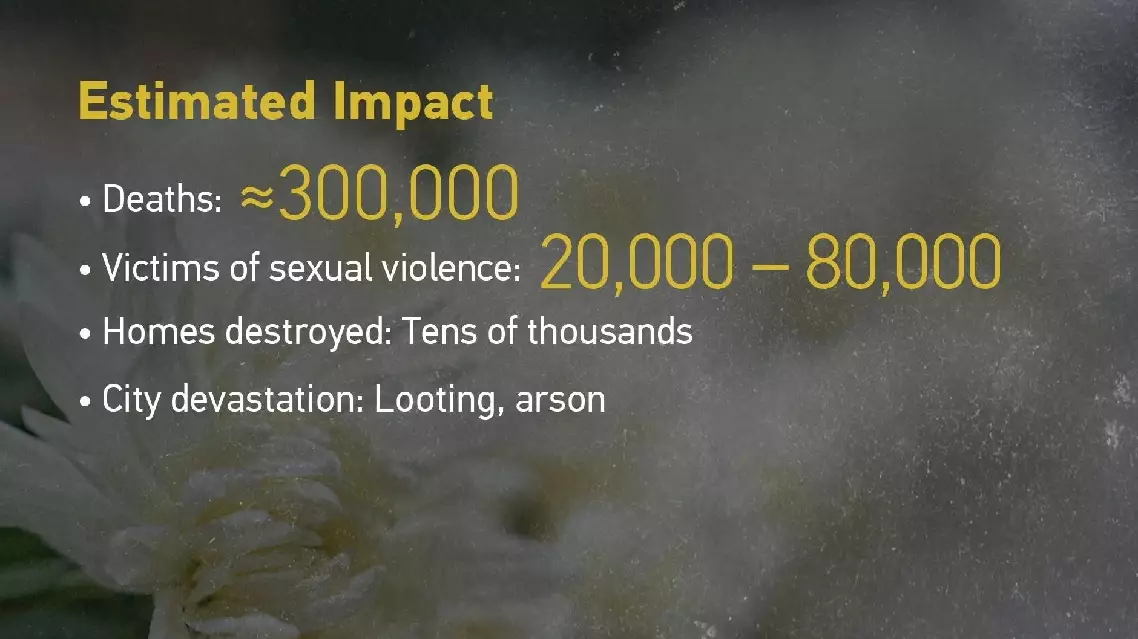 During the heinous atrocities, tens of thousands of women suffered sexual violence. Fires and looting left the city in ruins.