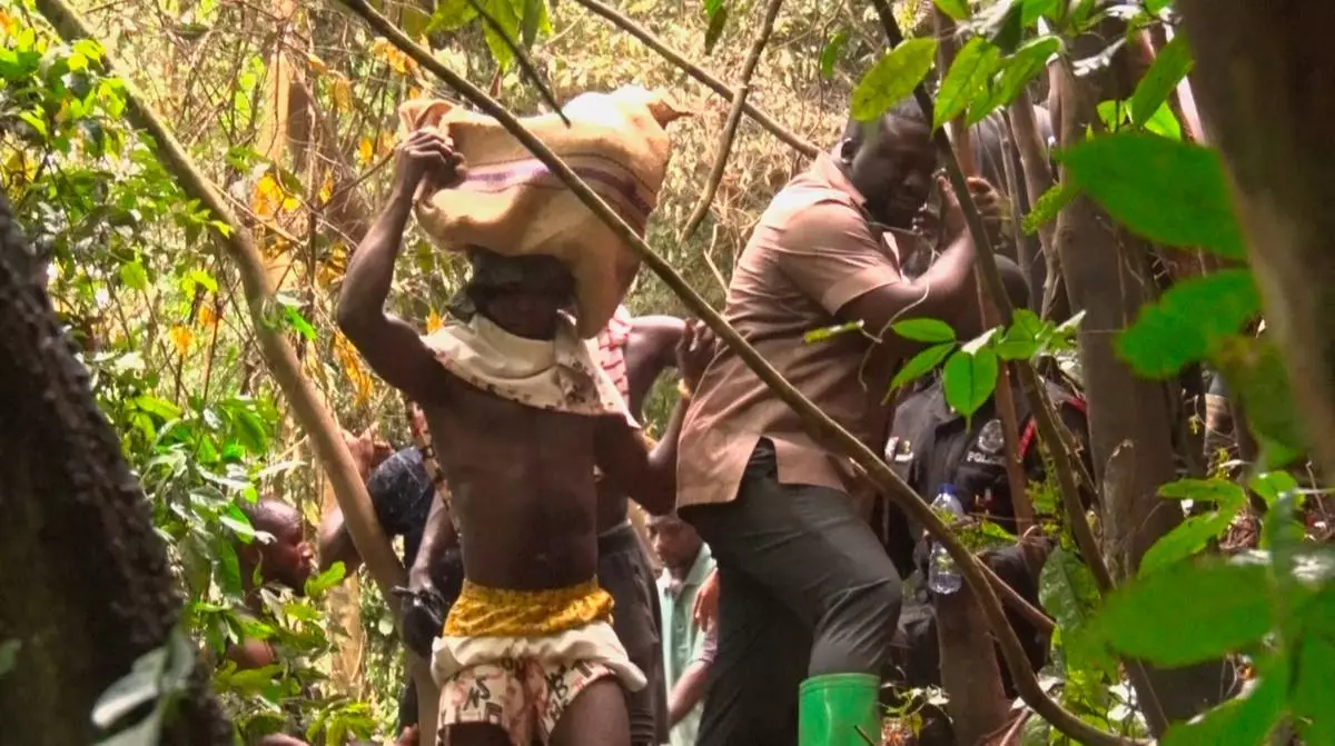 In this image taken from video, a man carries bodies retrieved from the military helicopter crash in Sikaman near Adansi, Ashanti region, Ghana, Wednesday, Aug. 6, 2025. (AP Photo/Hafiz Tijani)