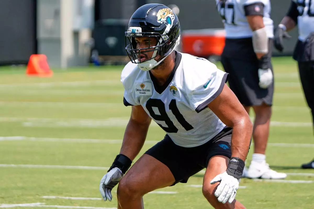 FILE - Jacksonville Jaguars defensive end Arik Armstead (91) runs through a drill during the team's NFL football practice, Monday, May 19, 2025, in Jacksonville, Fla. (AP Photo/John Raoux, File)