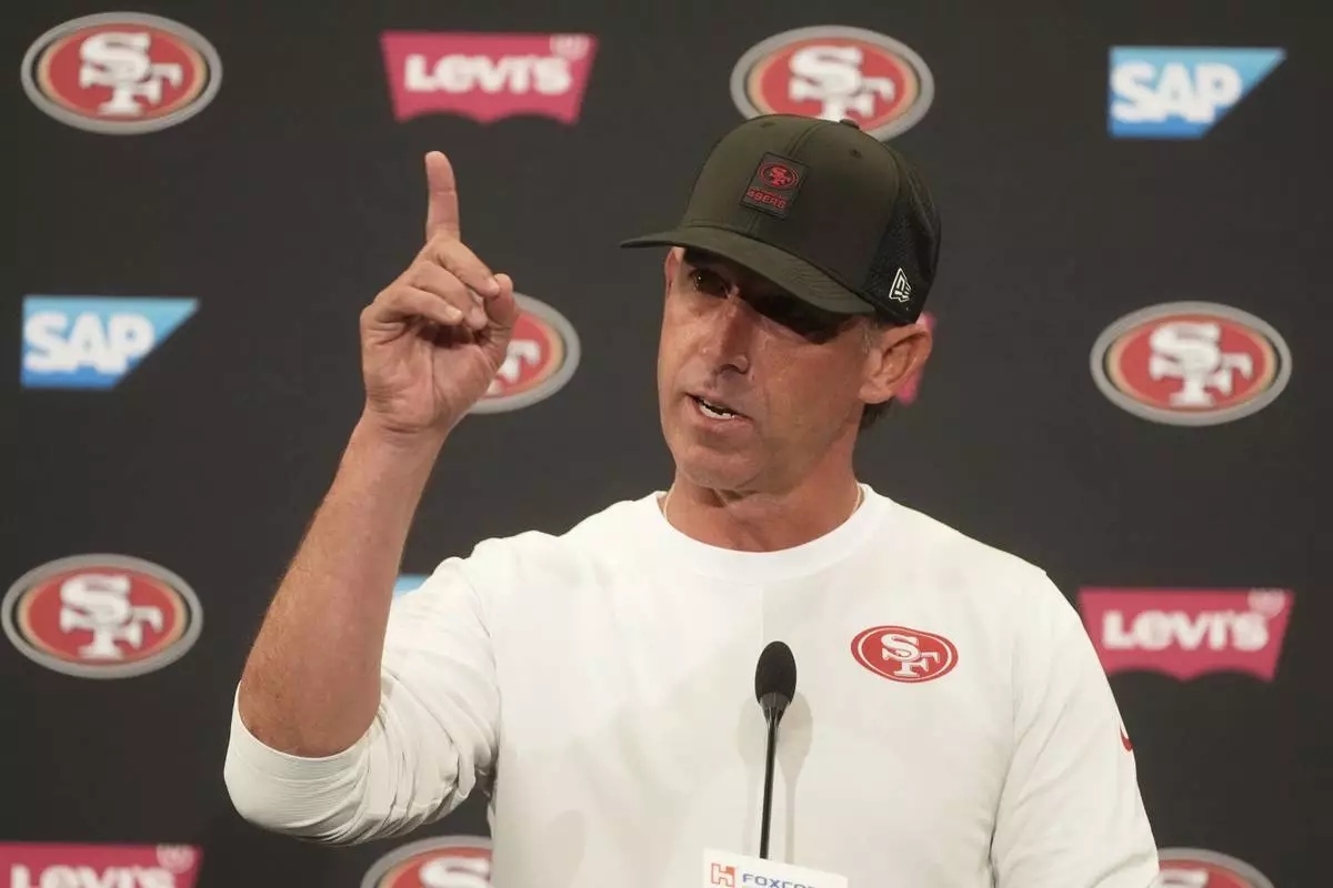 San Francisco 49ers head coach Kyle Shanahan speaks during a news conference after practice at the team's NFL football training camp, Sunday, July 27, 2025, in Santa Clara, Calif. (AP Photo/Jeff Chiu)