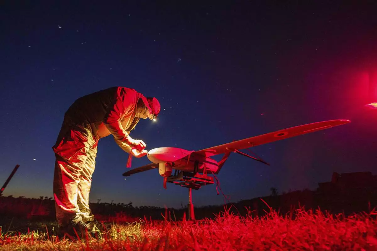A Ukrainian National Guard serviceman of 3rd brigade, Spartan, prepares a Penguin UAV for flight near the frontline in Pokrovsk direction, Ukraine, Wednesday, Aug. 6, 2025. (AP Photo/Evgeniy Maloletka)