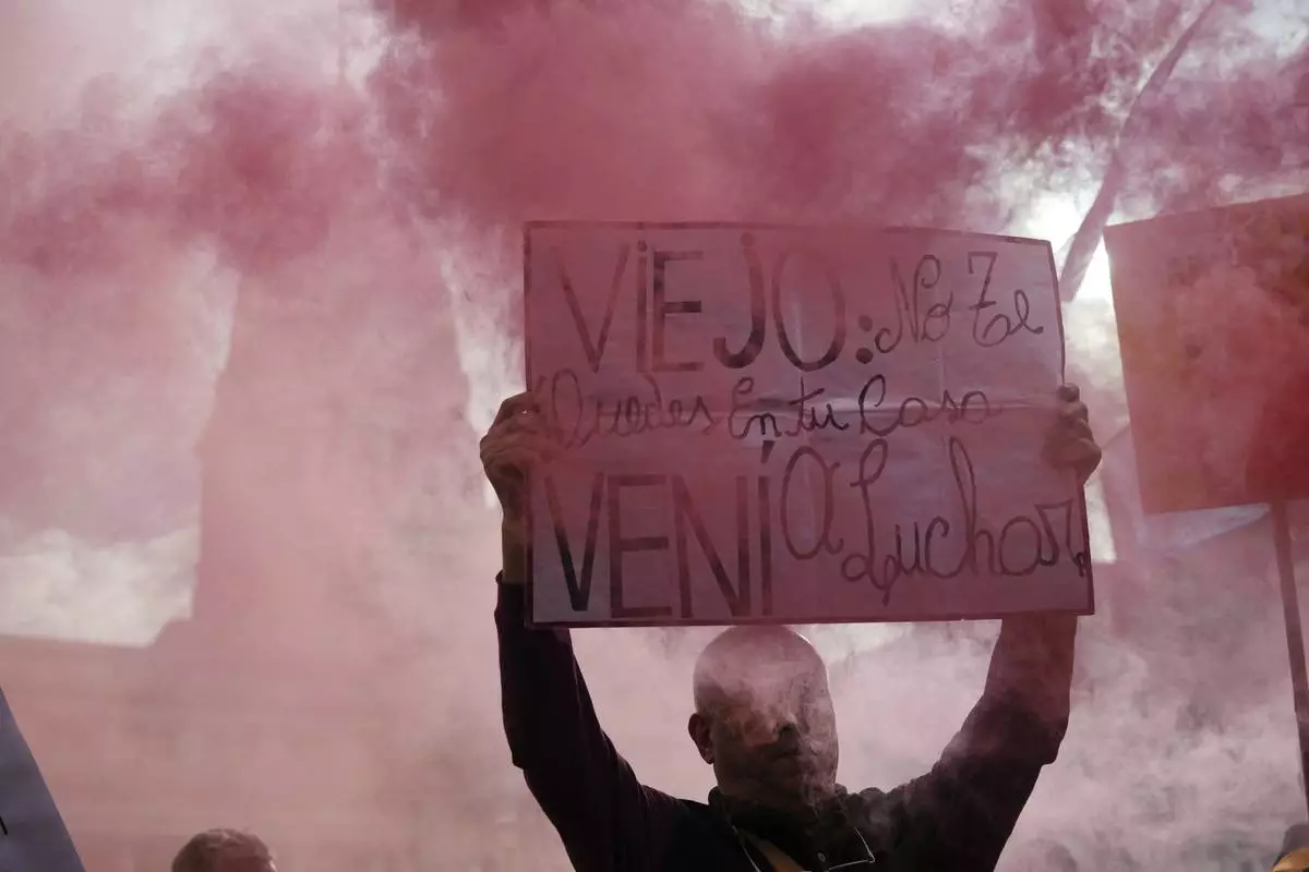 A protester holds a banner reading in Spanish, "Elderly, don't stay at home, come fight" during a weekly protest outside Congress demanding better pensions for retirees, in Buenos Aires, Argentina, Wednesday, Aug. 6, 2025. (AP Photo/Rodrigo Abd)