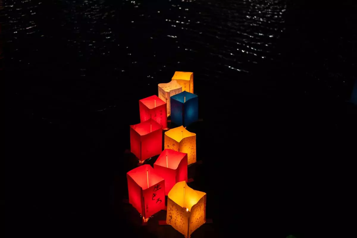 Paper lanterns float along the Motoyasu river in front of the Atomic Bomb Dome on the 80th anniversary of the WWII U.S. atomic bombing in Hiroshima, Wednesday, Aug. 6, 2025. (AP Photo/Louise Delmotte)