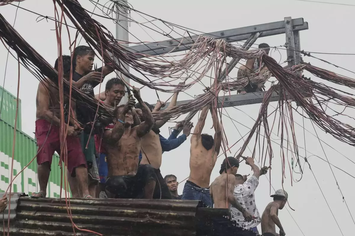 Residents salvage electrical wire which they will sell later after a fire hit a poor community in Manila, Philippines, on Wednesday, Aug. 6, 2025. (AP Photo/Aaron Favila)