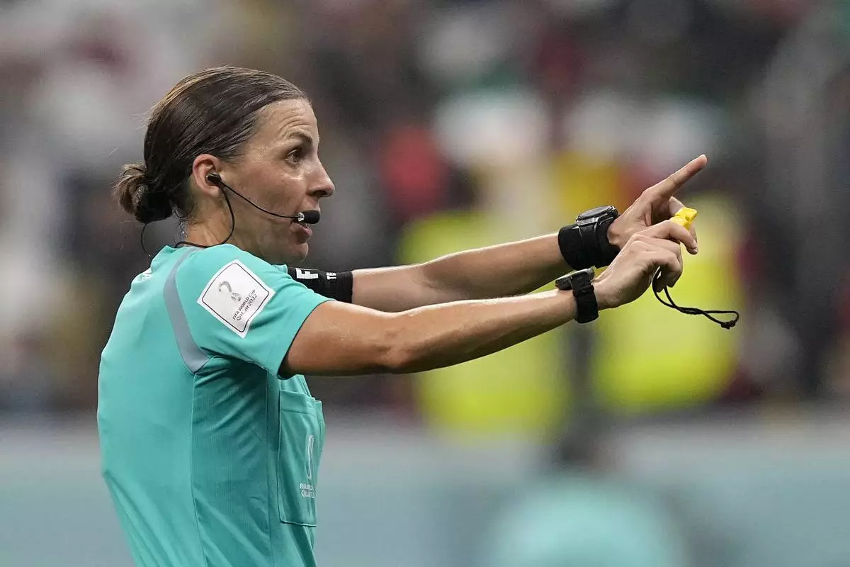 FILE - Referee Stephanie Frappart gestures during the World Cup group E soccer match between Costa Rica and Germany at the Al Bayt Stadium in Al Khor , Qatar, Thursday, Dec. 1, 2022. (AP Photo/Martin Meissner, File)