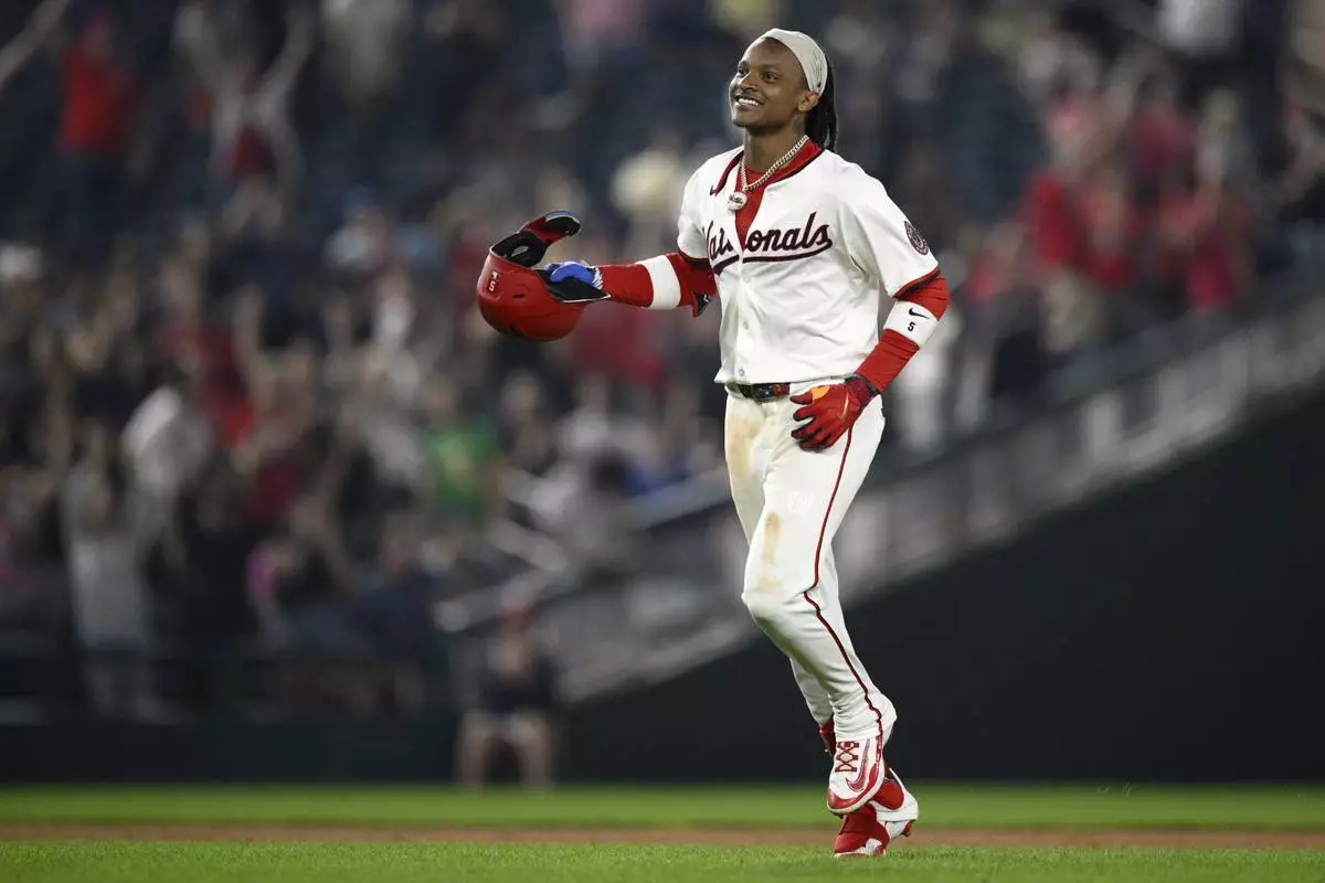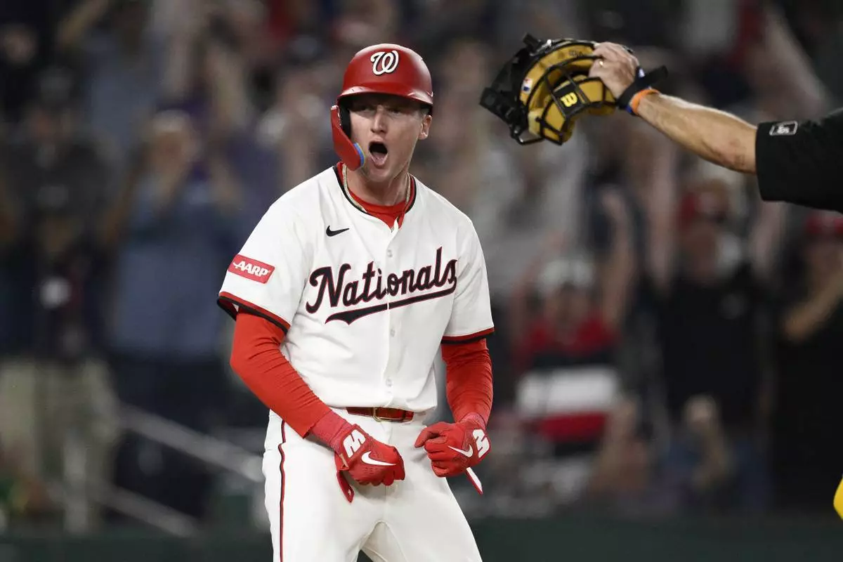 Washington Nationals' CJ Abrams celebrates after he hit a walk-off single to score Robert Hassell III for the game-winning run during the ninth inning of a baseball game against the Athletics, Wednesday, Aug. 6, 2025, in Washington. (AP Photo/Nick Wass)