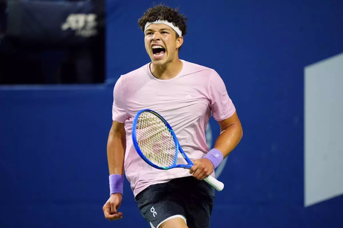 Ben Shelton, of the United States, celebrates after his win over Italy's Flavio Cobolli in their match at the National Bank Open men's tennis tournament in Toronto, Sunday, Aug. 3, 2025. (Frank Gunn/The Canadian Press via AP)