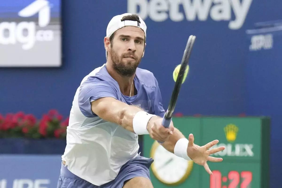 Karen Khachanov, of Russia, hits a return to Alexander Zverev, of Germany, during semifinal tennis action at the National Bank Open in Toronto on Wednesday, Aug., 6, 2025. (Chris Young/The Canadian Press via AP)