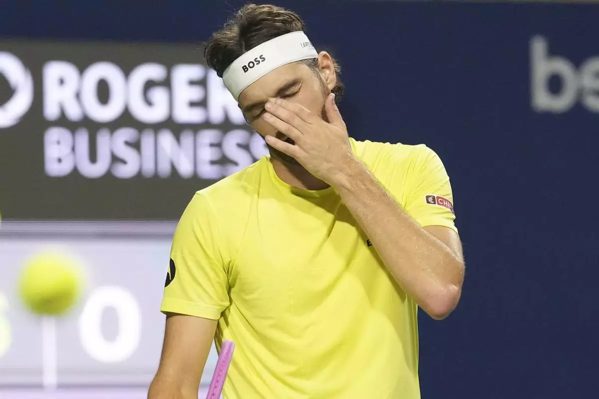 Taylor Fritz, of the United States, reacts during his loss to Ben Shelton, of the United States, after their semifinal match at the National Bank Open tennis tournament in Toronto on Wednesday, Aug. 6, 2025. (Chris Young/The Canadian Press via AP)