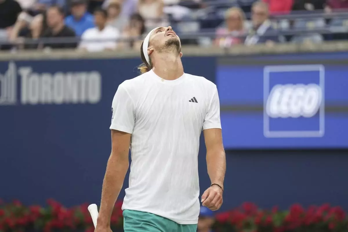 Alexander Zverev, of Germany, reacts during semifinal tennis action against Karen Khachanov, of Russia, at the National Bank Open in Toronto on Wednesday, Aug., 6, 2025. (Chris Young/The Canadian Press via AP)