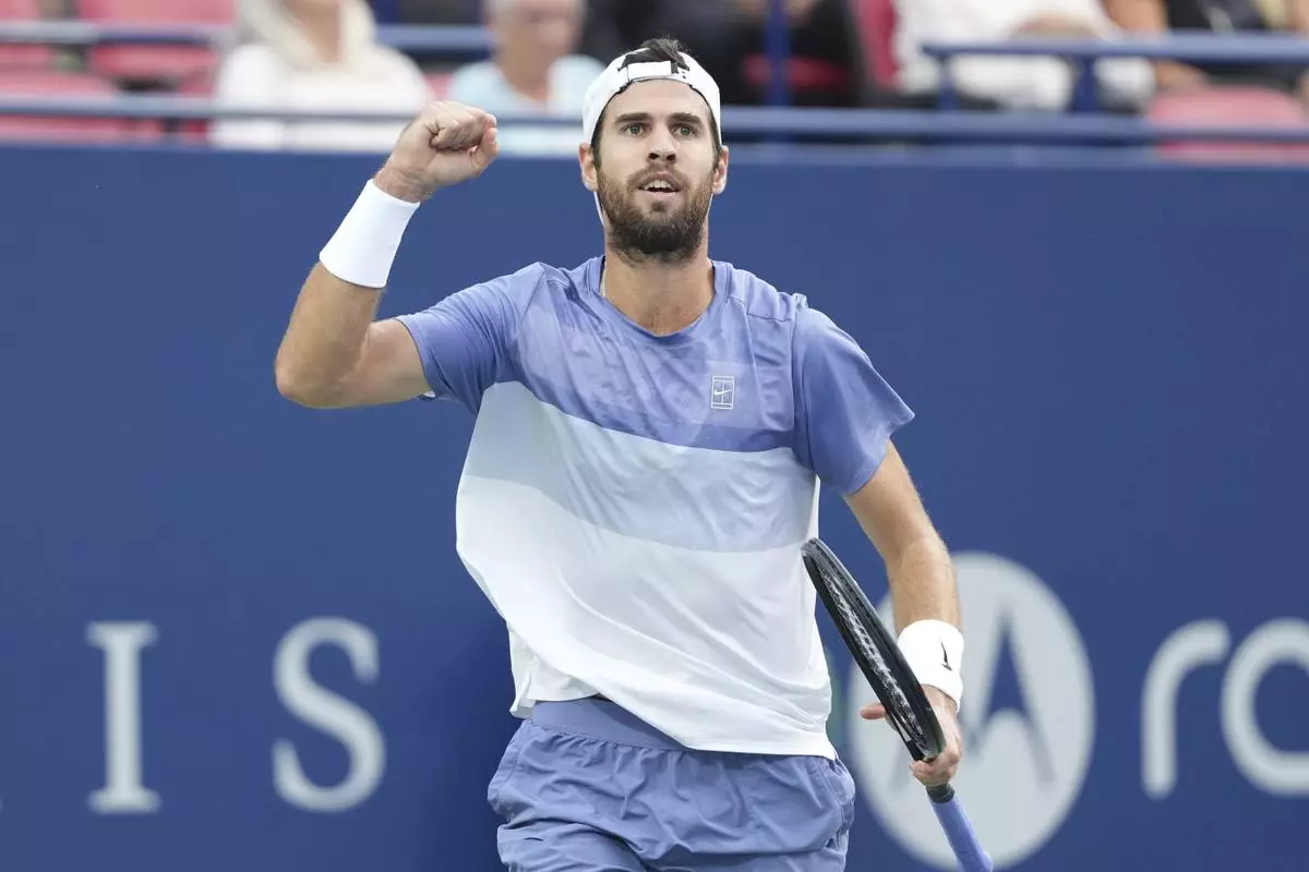 Karen Khachanov of Russia celebrates on his way to defeating Alex Michelsen of the United States, during their quarterfinal match at the National Bank Open men's tennis tournament in Toronto, Monday, Aug. 4, 2025. (Frank Gunn/The Canadian Press via AP)
