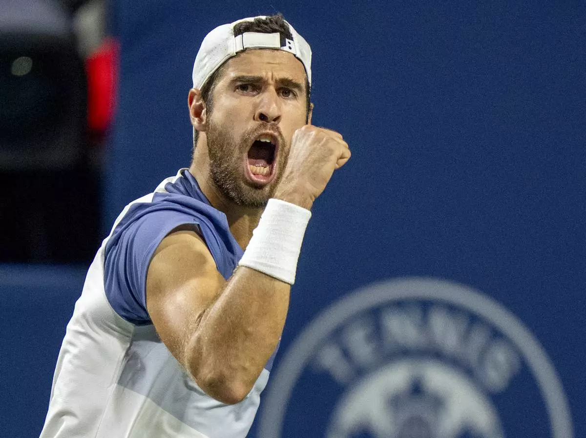 Karen Khachanov, of Russia, reacts during semifinal tennis action against Alexander Zverev, of Germany, at the National Bank Open in Toronto on Wednesday, Aug., 6, 2025. (Chris Young/The Canadian Press via AP)