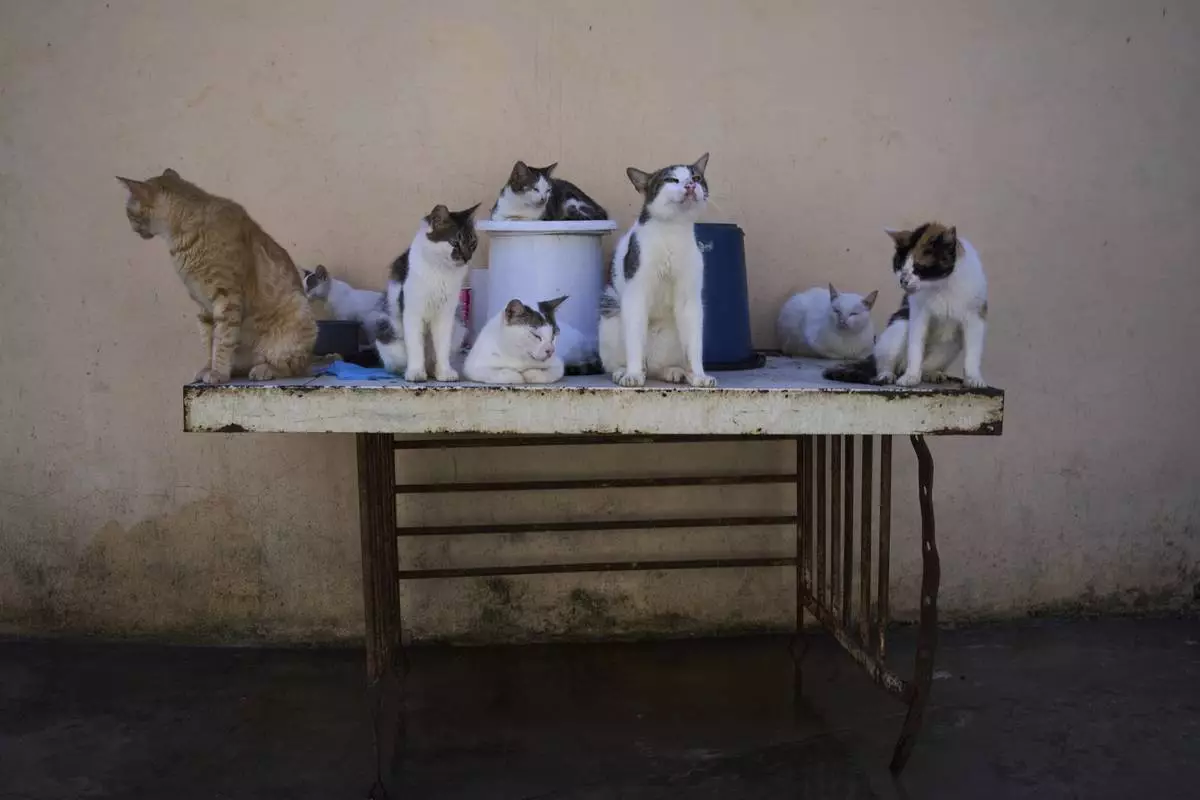 Stray cats gather on a table at the protected cat colony "Proyecto Aldameros," in a park in the historic area of Havana, Tuesday, Aug. 5, 2025. (AP Photo/Ramon Espinosa)