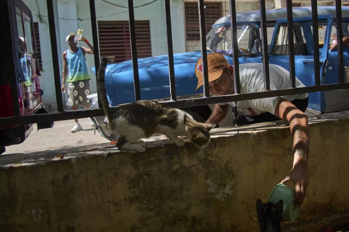 A taxi driver gives the rest of his lunch to stray cats from the protected cat colony "Proyecto Aldameros," at a park in Havana's historic area, Tuesday, Aug. 5, 2025. (AP Photo/Ramon Espinosa)