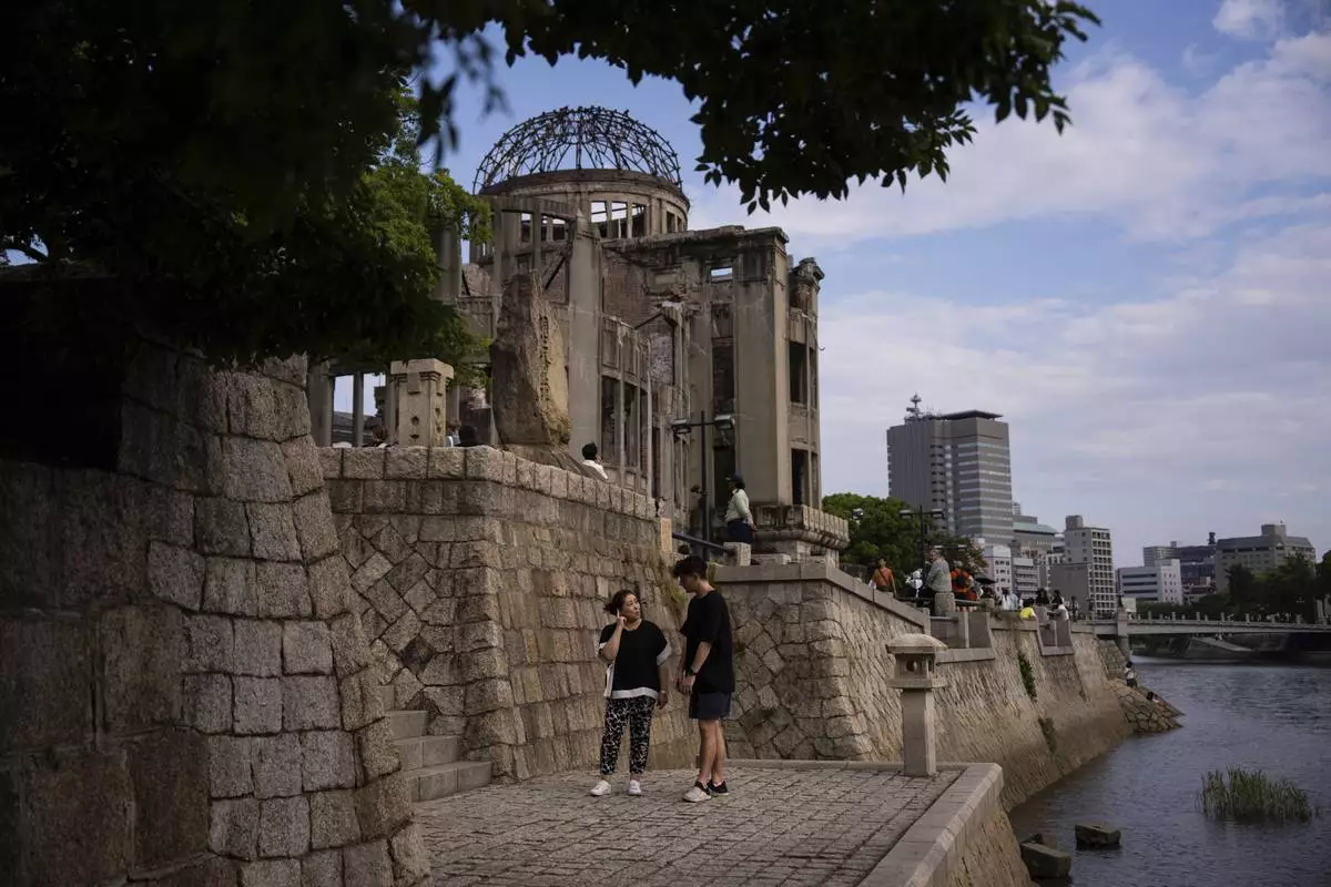 Ari Beser, left, and Kosuzu Harada, right, chat as they pose for photographs after an interview with The Associated Press in front of the Atomic Bomb Dome in Hiroshima, western Japan Tuesday, Aug. 5, 2025. (AP Photo/Louise Delmotte)