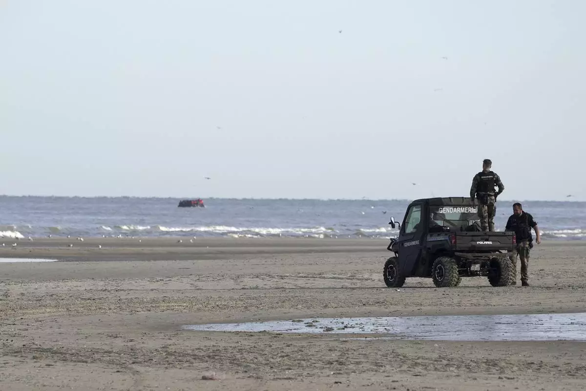 FILE - Gendarmes watch migrants on a small boat from Ecault beach, Friday July 4, 2025. (AP photo/John Leicester, File)