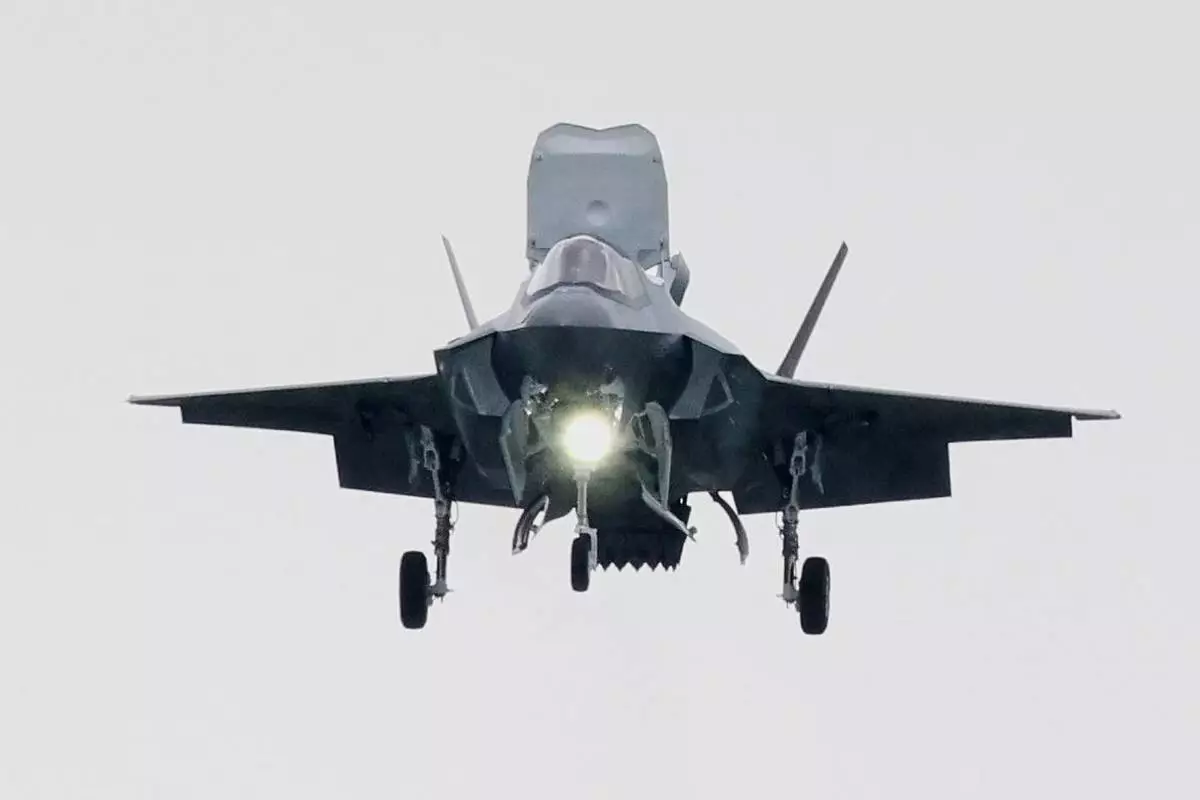 One of Japan's first three F-35B stealth fighter jets makes a vertical landing after they arrived at the Nyutabaru Air Base of the Air Self-Defense Force in Shintomi, southern Japan, Thursday, Aug. 7, 2025. (Takumi Sato/Kyodo News via AP)