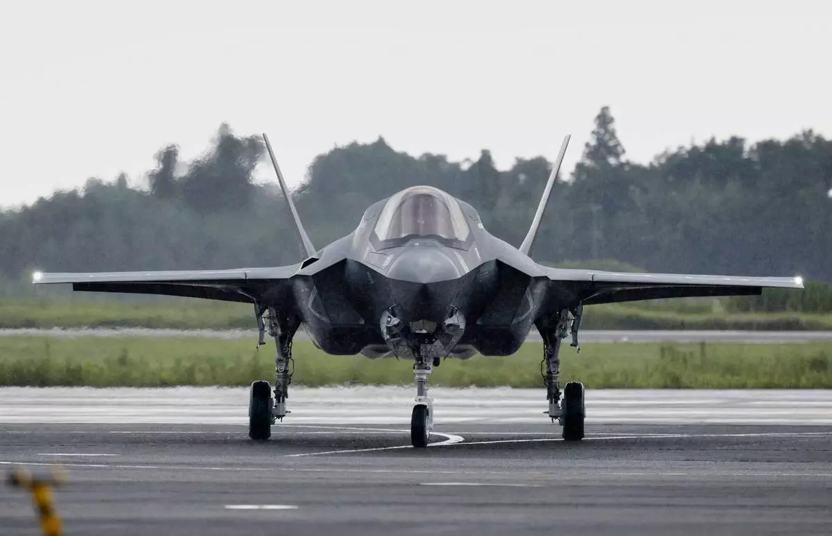 One of Japan's first three F-35B stealth fighter jets is seen after they arrived at the Nyutabaru Air Base of the Air Self-Defense Force in Shintomi, southern Japan, Thursday, Aug. 7, 2025. (Takumi Sato/Kyodo News via AP)