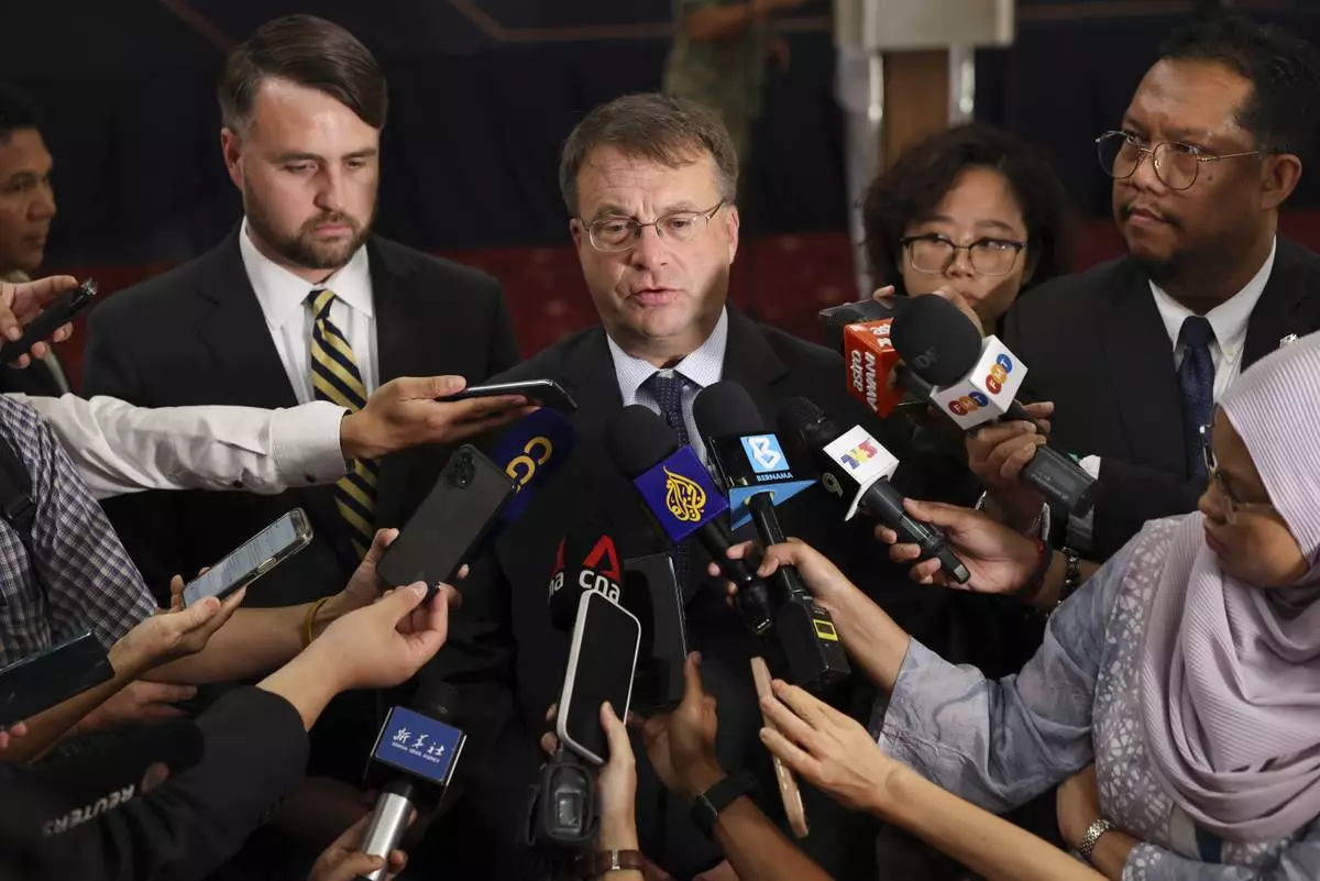 United States Ambassador to Malaysia Edgard D. Kagan speaks to media after a meeting of the Extraordinary General Border Committee (GBC) to discuss the border dispute between Thailand and Cambodian, in Kuala Lumpur, Malaysia, Thursday, Aug. 7, 2025. (Hasnoor Hussain/Pool Photo via AP)